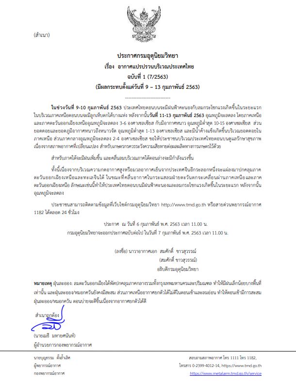 ในช่วงวันที่ 9-10 กุมภาพันธ์ 2563 ประเทศไทยตอนบนจะมีฝนฟ้าคะนองกับลมกระโชกแรงเกิดขึ้นในระยะแรก ในบริเวณภาคเหนือตอนบนจะมีลูกเห็บตกได้บางแห่ง หลังจากนั้นวันที่ 11-13 กุมภาพันธ์ 2563 อุณหภูมิจะลดลง โดยภาคเหนือและภาคตะวันออกเฉียงเหนืออุณหภูมิจะลดลง 3-6 องศาเซลเซียส กับมีอากาศหนาว อุณหภูมิต่ำสุด 10-15 องศาเซลเซียส