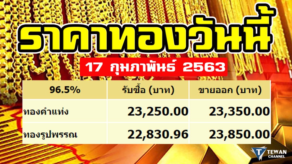 ราคาทองวันนี้ ราคาทองตามประกาศของสมาคมค้าทองคำ ประจำวันที่ 17/02/2563 เวลา 09:30 น. (ครั้งที่ 1) ราคาทองตามประกาศของสมาคมค้าทองคำ ประจำวันที่ 17/02/2563 เวลา 09:30 น. (ครั้งที่ 1) 96.5%รับซื้อ (บาท)ขายออก (บาท)ทองคำแท่ง23,250.0023,350.00ทองรูปพรรณ22,830.9623,850.00 แบ่งปันสิ่งนี้:Tweet แชร์บน Reddit(เปิดในหน้าต่างใหม่) Reddit แชร์บน Tumblr พิมพ์(เปิดในหน้าต่างใหม่) พิมพ์ กระเป๋า แชร์บน Telegram(เปิดในหน้าต่างใหม่) Telegram แชร์บน WhatsApp(เปิดในหน้าต่างใหม่) WhatsApp อีเมลลิงก์ให้เพื่อน(เปิดในหน้าต่างใหม่) อีเมล ถูกใจ กำลังโหลด... ที่เกี่ยวข้อง