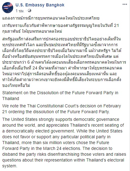 สหรัฐออกแถลงการณ์ / เมื่อวันที่ 22 ก.พ. ผู้สื่อข่าวรายงานว่า สถานเอกอัครราชทูตสหรัฐอเมริกาประจำประเทศไทย ออกแถลงการณ์เรื่อง การยุบพรรคอนาคตใหม่ในประเทศไทย ระบุว่า เรารับทราบเกี่ยวกับคำพิพากษาของศาลรัฐธรรมนูญไทยในวันที่ 21 กุมภาพันธ์ ให้ยุบพรรคอนาคตใหม่ สหรัฐอเมริกาส่งเสริมการปกครองระบอบประชาธิปไตยอย่างเต็มที่ในทุกประเทศทั่วโลก และชื่นชมประเทศไทยที่มีรัฐบาลซึ่งมาจากการเลือกตั้ง โดยวิถีแห่งประชาธิปไตยเมื่อไม่นานมานี้