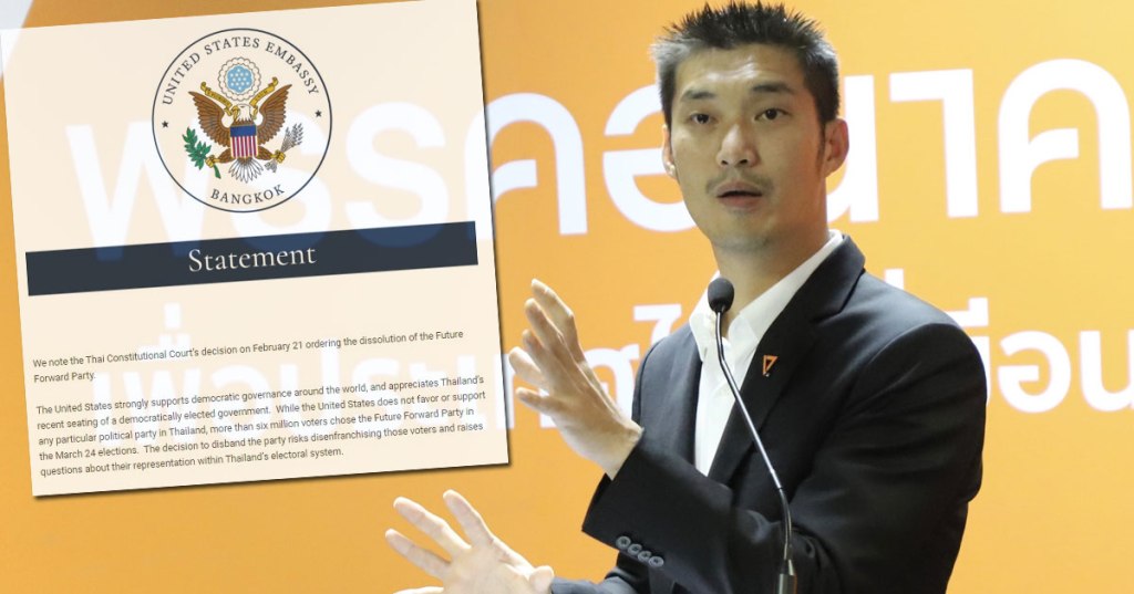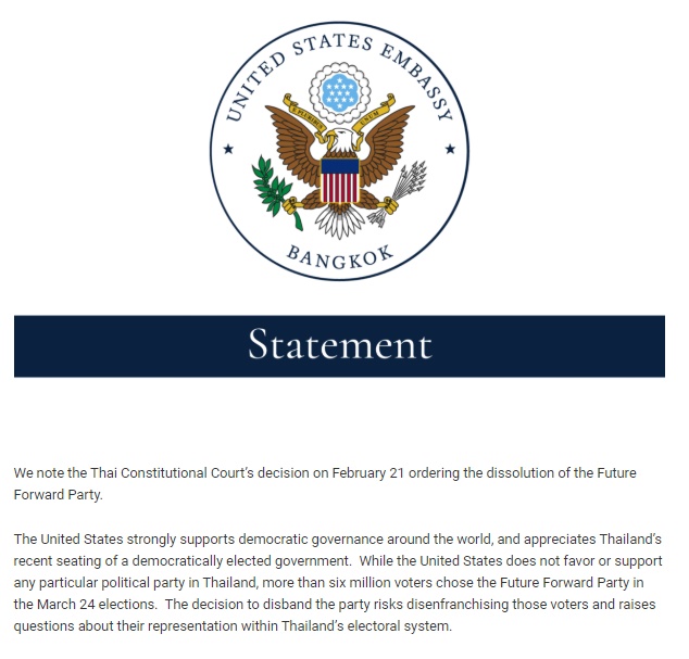 สหรัฐฯ ออกแถลงการณ์ ยุบพรรคอนาคตใหม่ ลิดรอนสิทธิ์ 6 ล้านคะแนนเสียง ถามพวกเขาจะยังคงมีสิทธิ์มีเสียงในระบบการเลือกตั้งของไทยหรือไม่