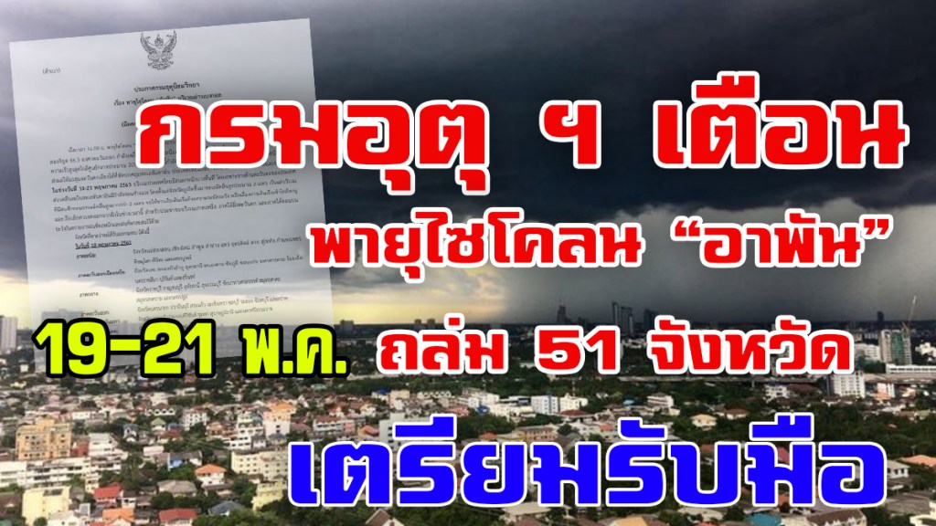 อุตุฯ ประกาศเตือน 51 จังหวัดทั่วประเทศ เตรียมรับมือพายุไซโคลน “อำพัน” วันนี้ (19 พ.ค.) เมื่อเวลา 05.00 น. กรมอุตุนิยมวิทยา ออกประกาศ เรื่อง พายุไซโคลน “อำพัน” บริเวณอ่าวเบงกอล (มีผลกระทบถึงวันที่ 21 พฤษภาคม 2563) ฉบับที่ 4 โดยมีเนื้อหาดังนี้ เมื่อเวลา 04.00 น. พายุไซโคลน “อำพัน” บริเวณอ่าวเบงกอลตอนกลาง มีศูนย์กลางอยู่ที่ละติจูด 15.2 องศาเหนือ ลองจิจูด 86.6 องศาตะวันออก มีความเร็วสูงสุดใกล้ศูนย์กลางประมาณ 220 กม./ชม. และกำลังเคลื่อนตัวทางทิศเหนือ ค่อนตะวันออกเล็กน้อยด้วยความเร็วประมาณ 15 กม./ชม. โดยจะเคลื่อนขึ้นฝั่งบริเวณประเทศอินเดียตอนบนและประเทศบังคลาเทศ ในระยะต่อไป พายุนี้ส่งผลให้มรสุมตะวันตกเฉียงใต้ที่พัดปกคลุมทะเลอันดามัน ประเทศไทยและอ่าวไทย มีกำลังแรงขึ้น ลักษณะเช่นนี้ในช่วงวันที่ 19-21 พฤษภาคม 2563 บริเวณประเทศไทยจะมีฝนตกหนักบางพื้นที่ โดยเฉพาะทางด้านตะวันตกของประเทศ ส่วนคลื่นลมในทะเลอันดามันมีกำลังค่อนข้างแรง โดยตั้งแต่จังหวัดภูเก็ตขึ้นมาทะเลมีคลื่นสูงประมาณ 2 เมตร เว้นแต่บริเวณที่มีฝนฟ้าคะนองจะมีคลื่นสูงมากกว่า 2 เมตร ขอให้ชาวเรือเดินเรือด้วยความระมัดระวัง หลีกเลี่ยงการเดินเรือเข้าใกล้พายุ และเรือเล็กควรงดออกจากฝั่งในช่วงเวลานี้ สำหรับประชาชนบริเวณภาคเหนือ ภาคใต้ฝั่งตะวันตก และภาคใต้ตอนบน ระวังอันตรายจากฝนที่ตกหนักและฝนที่ตกสะสมไว้ด้วย จังหวัดที่คาดว่าจะได้รับผลกระทบ มีดังนี้ ในวันที่ 19 พฤษภาคม 2563 ภาคเหนือ จังหวัดแม่ฮ่องสอน เชียงใหม่ ลำพูน ลำปาง แพร่ อุตรดิตถ์ ตาก สุโขทัย กำแพงเพชร พิษณุโลก พิจิตร และเพชรบูรณ์ ภาคตะวันออกเฉียงเหนือ จังหวัดเลย หนองบัวลำภู อุดรธานี หนองคาย บึงกาฬ สกลนคร นครพนม ชัยภูมิ ขอนแก่น นครราชสีมา บุรีรัมย์ สุรินทร์ ศรีสะเกษ และอุบลราชธานี ภาคกลาง จังหวัดราชบุรี กาญจนบุรี อุทัยธานี สุพรรณบุรี ชัยนาท นครสวรรค์ สมุทรสาคร สมุทรสงคราม และนครปฐม รวมทั้งกรุงเทพมหานครและปริมณฑล ภาคตะวันออก จังหวัดนครนายก ปราจีนบุรี สระแก้ว ฉะเชิงเทรา ชลบุรี ระยอง จันทบุรี และตราด ภาคใต้ฝั่งตะวันออก จังหวัดเพชรบุรี ประจวบคีรีขันธ์ ชุมพร และสุราษฎร์ธานี ภาคใต้ฝั่งตะวันตก จังหวัดระนอง พังงา และภูเก็ต ในวันที่ 20-21 พฤษภาคม 2563 ภาคเหนือ จังหวัดแม่ฮ่องสอน ตาก สุโขทัย กำแพงเพชร พิษณุโลก พิจิตร และเพชรบูรณ์ ภาคตะวันออกเฉียงเหนือ จังหวัดเลย หนองบัวลำภู ชัยภูมิ ขอนแก่น นครราชสีมา บุรีรัมย์ สุรินทร์ ศรีสะเกษ และอุบลราชธานี ภาคกลาง จังหวัดราชบุรี กาญจนบุรี อุทัยธานี สุพรรณบุรี ชัยนาท สมุทรสาคร สมุทรสงคราม และนครปฐม รวมทั้