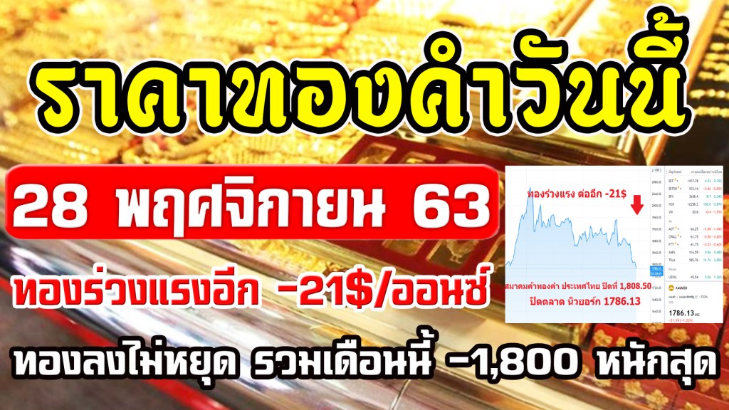 ราคาทองคำวันนี้ 28/11/63 ราคาทองวันนี้ 28พฤศจิกายน63 วิเคราะห์ทอง ทองร่วงแรงอีก 21$ รวม พ.ย. -1800บ.