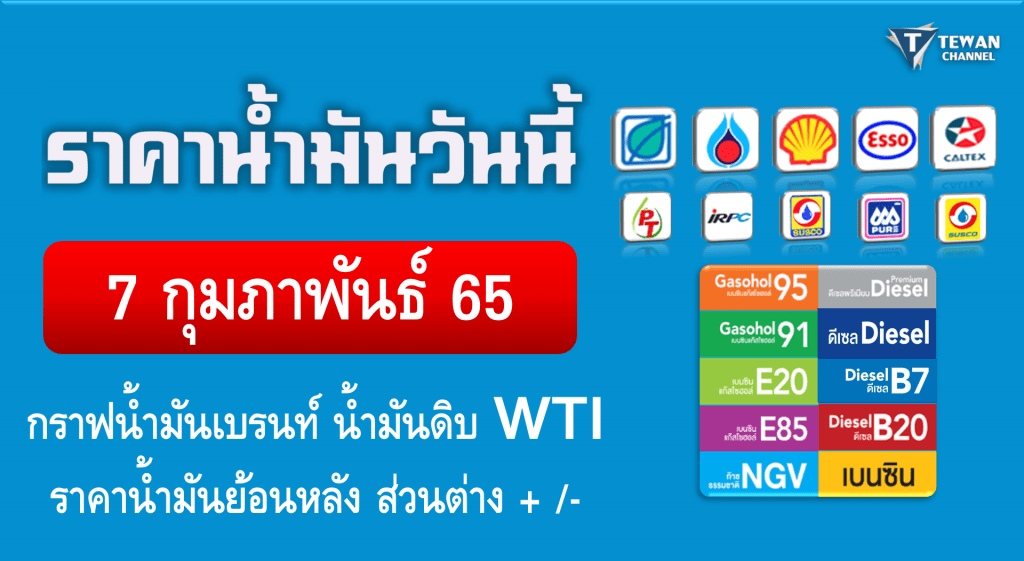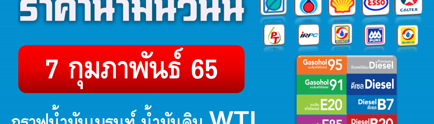 ราคาน้ำมันวันนี้ 7กุมภาพันธ์65 ราคาน้ำมันวันที่ 7/2/65 ราคาน้ำมันล่าสุด ราคาน้ำมันพรุ่งนี้ ปตท. บางจาก เชลล์ เอสโซ่ คาลเท็กซ์ ไออาร์พีซี พีที ซัสโก้ เพียว